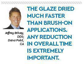 Calling Enamelite easy and consistent, Dr. Pursel agreed that the glaze didn’t puddle in the anatomy of the restoration, and Dr. Robert Conte said he liked the product’s ease of delivery, describing it as a very consistent glaze. While glazing his milled crowns, Dr. Steven Feigelson said Enamelite provided “a more even coat of glaze [with] consistent coverage,” and Dr. Jayendra Patel commented, “It sprays nicely. I did not get any pooling or bubbling.” A few dentists had trouble with the straw fitting correctly in the spray nozzle, and Dr. Samuel Barr said he would prefer a thicker consistency so that perhaps only one coat would need to be applied.