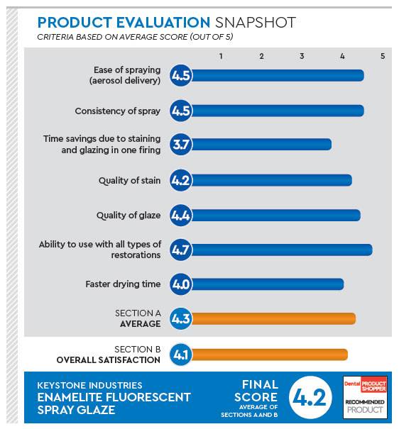As business owners, dentists are always looking for ways to improve productivity without sacrificing quality. In his CAD/CAM practice, Dr. Kevin Pursel knows that each step of the restoration-making process needs to be performed with accuracy and efficiency. Specifically, Dr. Pursel was looking for easy and consistent glazing of his CEREC restorations when he tested Keystone Industries’ Enamelite Low-Fusing Fluorescent Ceramic Spray Glaze for this Dental Product Shopper evaluation. He not only found that Enamelite was easy to apply with consistent results, but Dr. Pursel and the other evaluators were pleased to discover some additional advantages of this spray glaze.